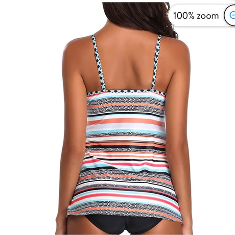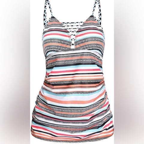 Two-Piece striped Tankini Set. Swim Top & Swim Bottoms Print Swimwear with Push-up Padded Bra. Top has very nice crisscross style. Brand new in package. Size Large.